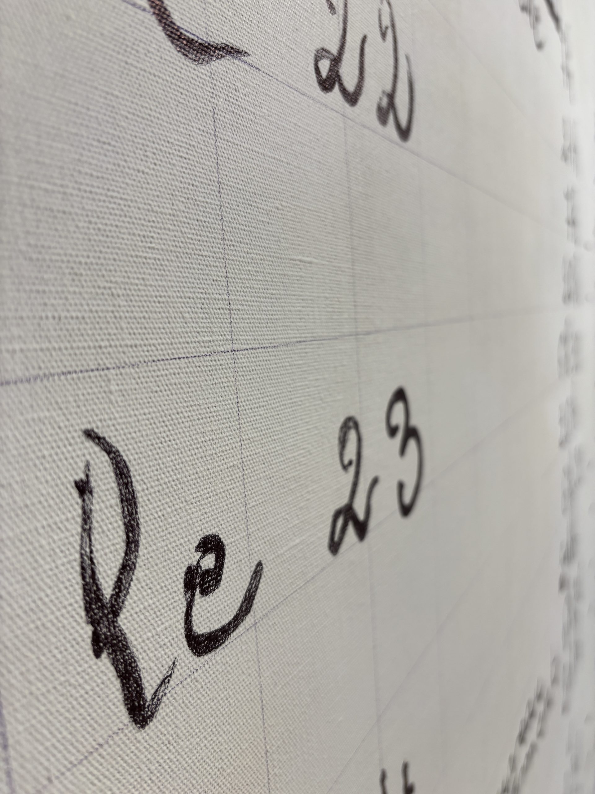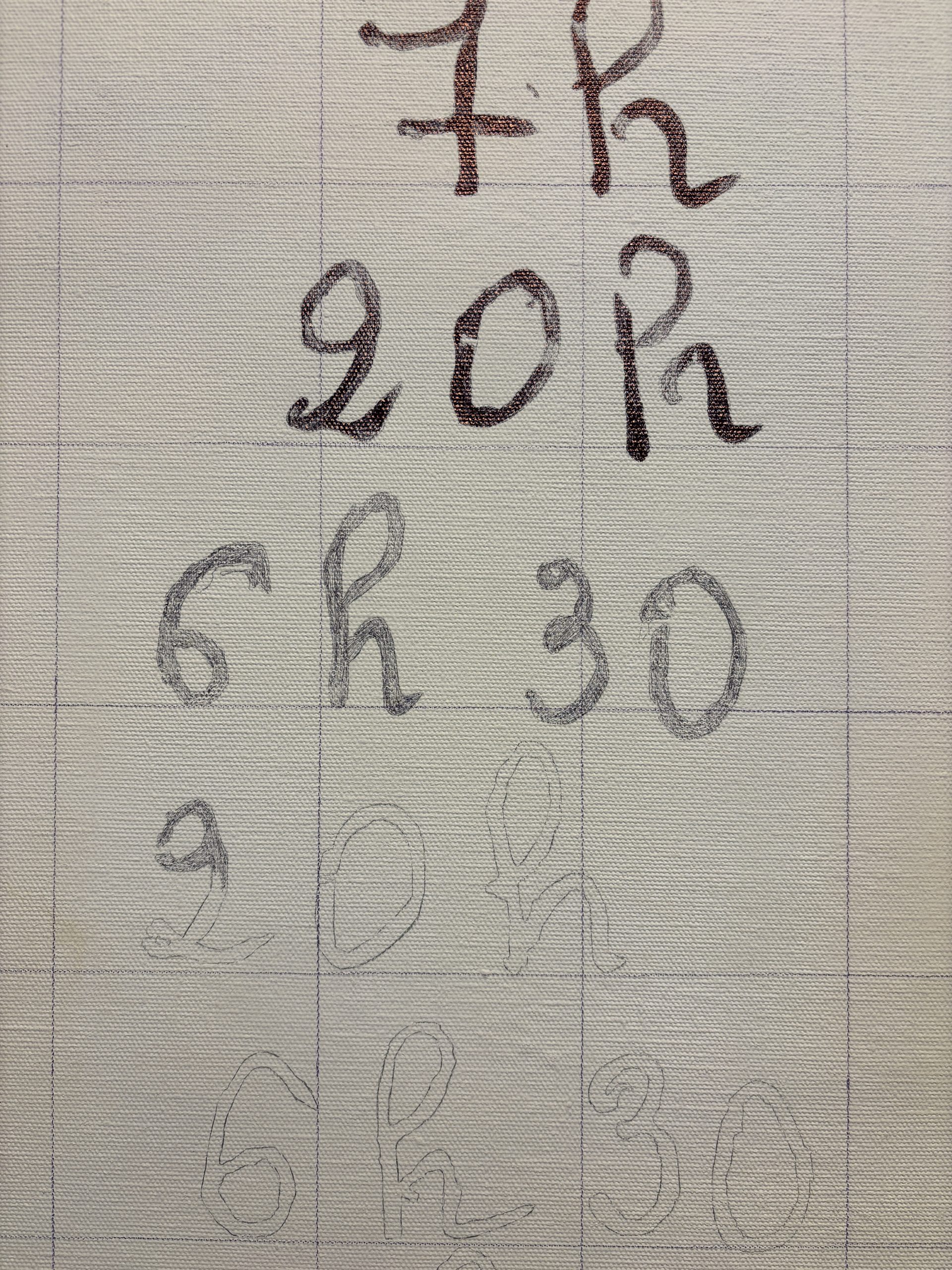 Mon geste est une copie, celle de la première page, une reproduction, de sa mise en page à son écriture manuscrite. La taille est multipliée, pour voir les détails, être plus proche. Redessiner son écriture dans un rituel répétitif, en reconnaissance du sien.