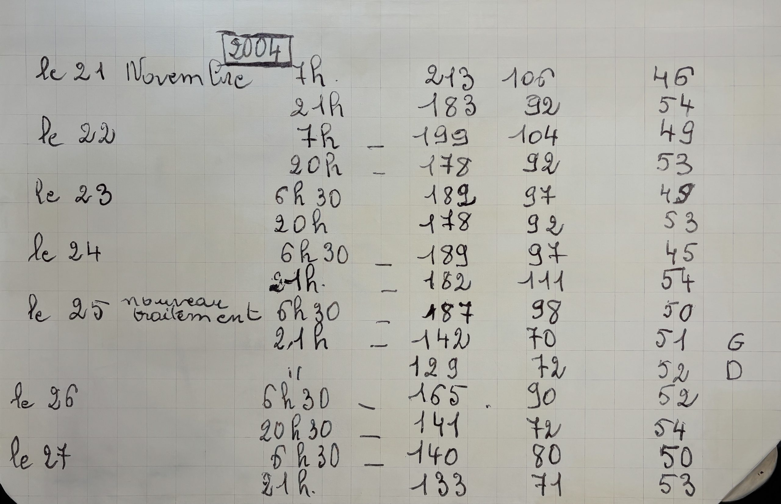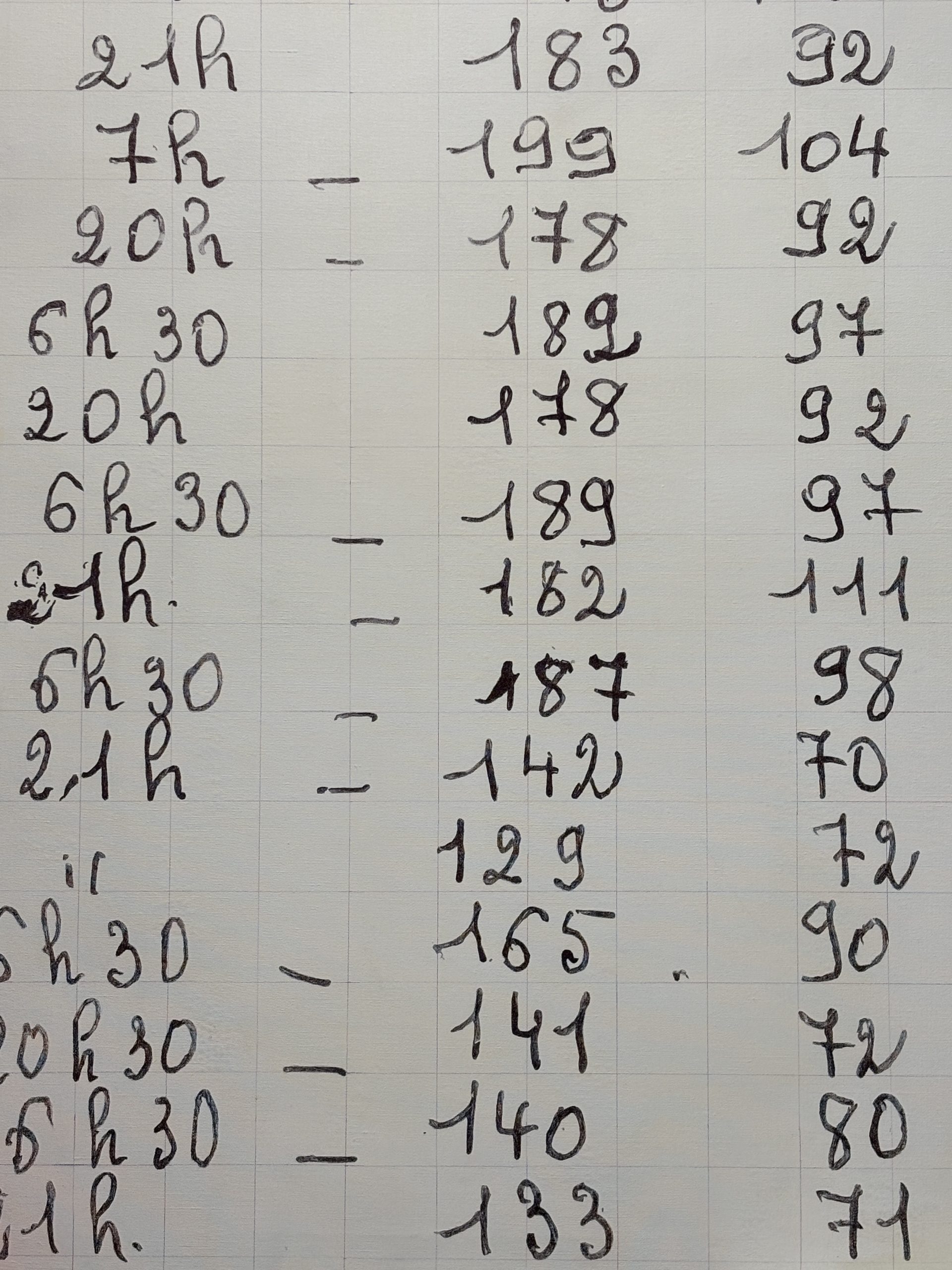 Josette n’écrivait pas de journal intime, ne tenait pas d’agenda, elle avait de grands calendriers annuels en carton pour y souligner quelques jours de l’année. Le 21 novembre 2004, sur les conseils de son médecin et pendant 10 ans, elle a écrit méticuleusement dans des carnets, deux fois par jour, sa pression artérielle et ses battements de cœur par minute. Les traces d’une circulation, des chiffres physiologiques qui marquent le temps.